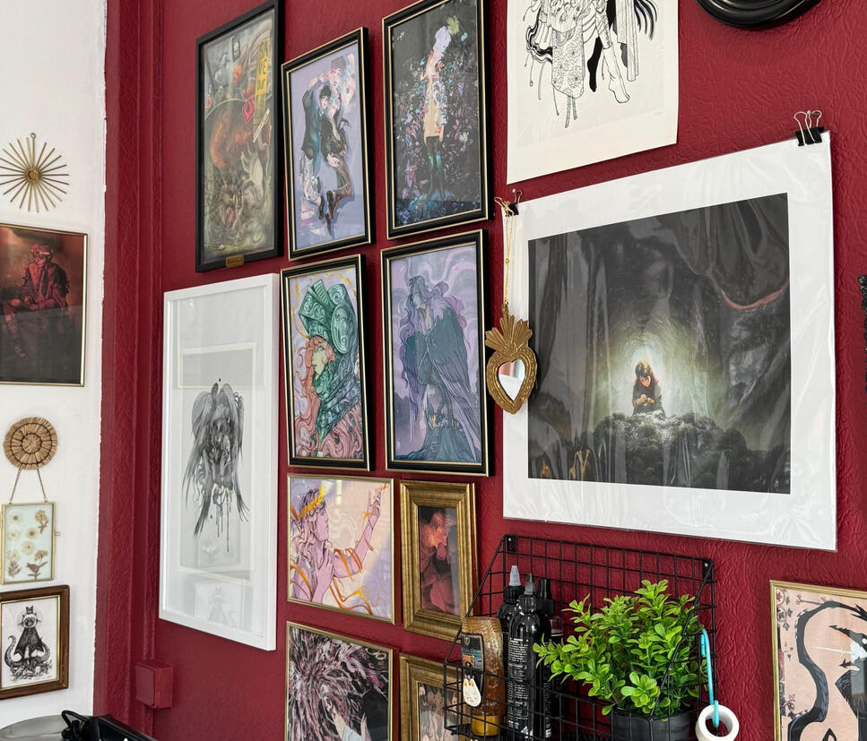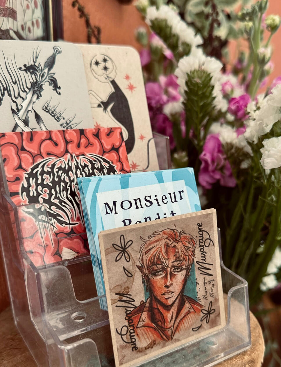 Dans le salon, vous pourrez aussi retrouver :• Des illustrations, des stickers et pleins d’autres choses que vous pourrez rapporter à la maison pour soutenir nos artistes!• Un espace d’attente, avec de la lecture, un chargeur à disposition, des petites boissons, et des choses à grignoter!Et si vous avez besoin de la moindre chose, il ne faut surtout pas hésiter! Nous sommes là pour ça!